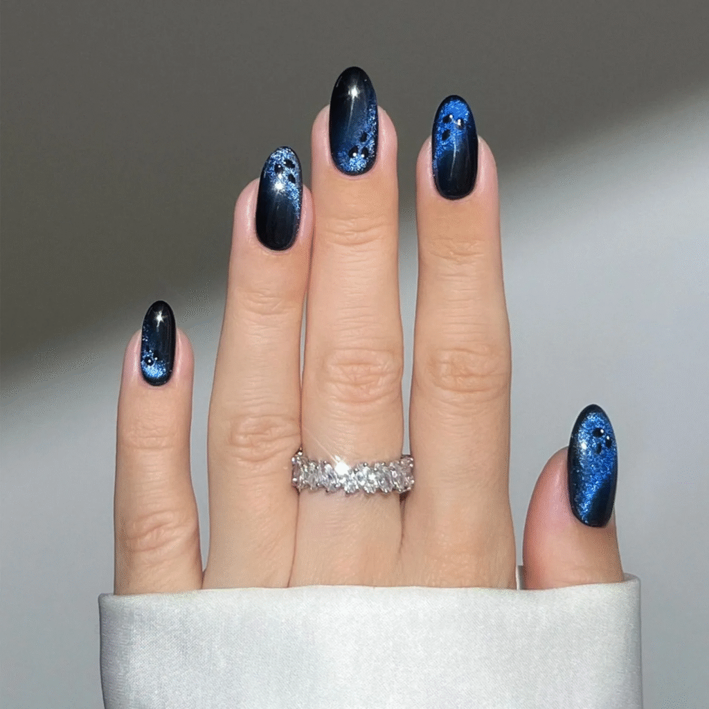 Velvet nails are all the rage this season, and they can be spooky too! Try using black and navy magnetic polishes for a midnight effect that’s both ethereal and haunting. This look requires a bit more skill, but the result is worth it.