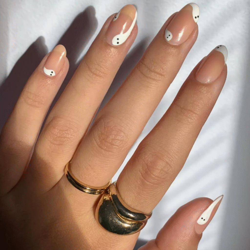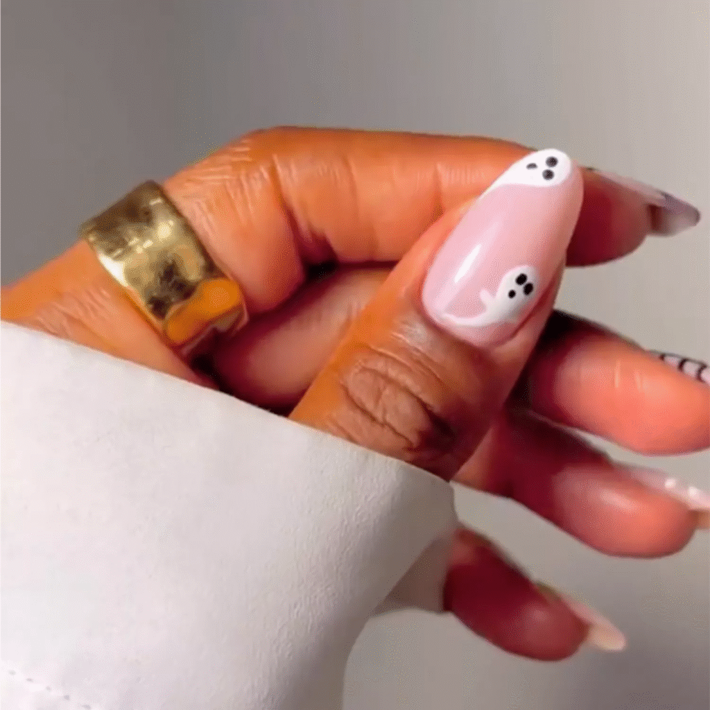 Negative space nail art is easy but impactful. Simply use a nude base and paint on small ghost designs. This design is low-effort but looks high-impact, making it perfect for a quick Halloween manicure.