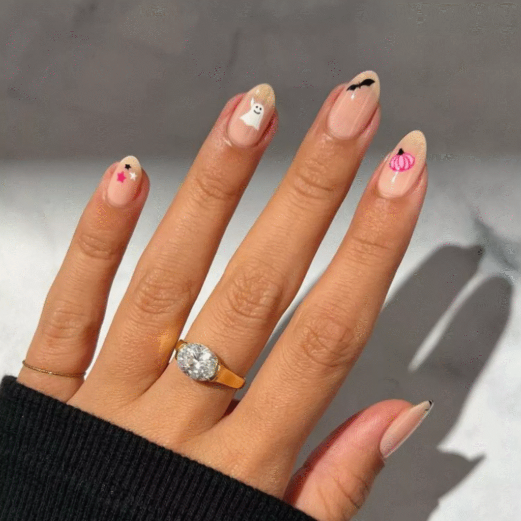 If you love adding a pop of color to your nails, why not try pink? A negative space manicure with ghost motifs and a touch of pink will give your nails a fun twist. You can also use Halloween-themed nail stickers for a simple yet cute design.