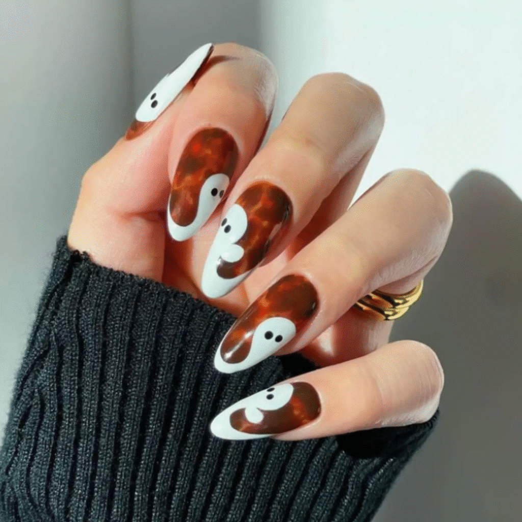 Tortoise shell nails are stylish all on their own, but adding ghosts can give them a spooky twist. The contrast between the crisp white ghosts and the brown tortoiseshell creates a chic Halloween look that’s not too over-the-top.