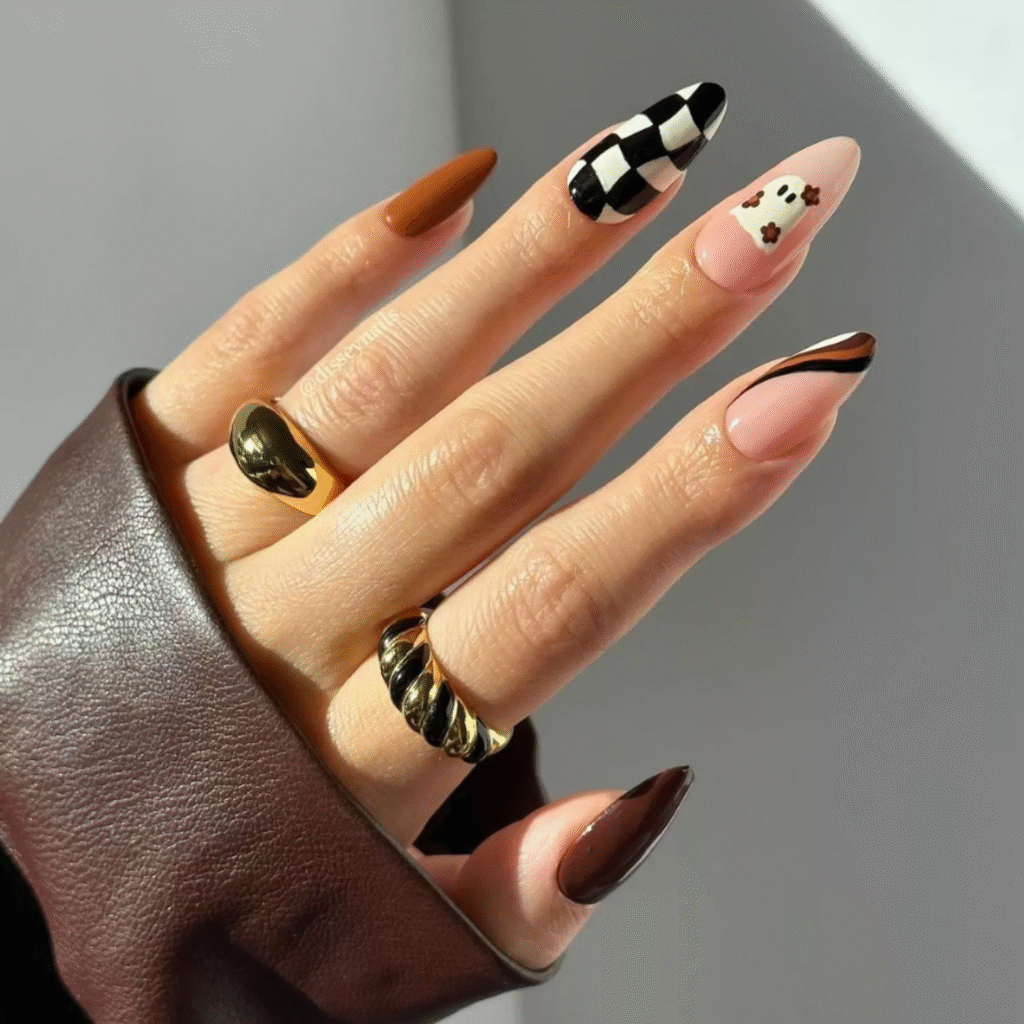 For a retro vibe, try a 70s-inspired ghost manicure. Using autumnal browns and adding little flowers can give your nails a groovy, vintage look. This design is perfect for those who want a Halloween vibe without going too spooky.