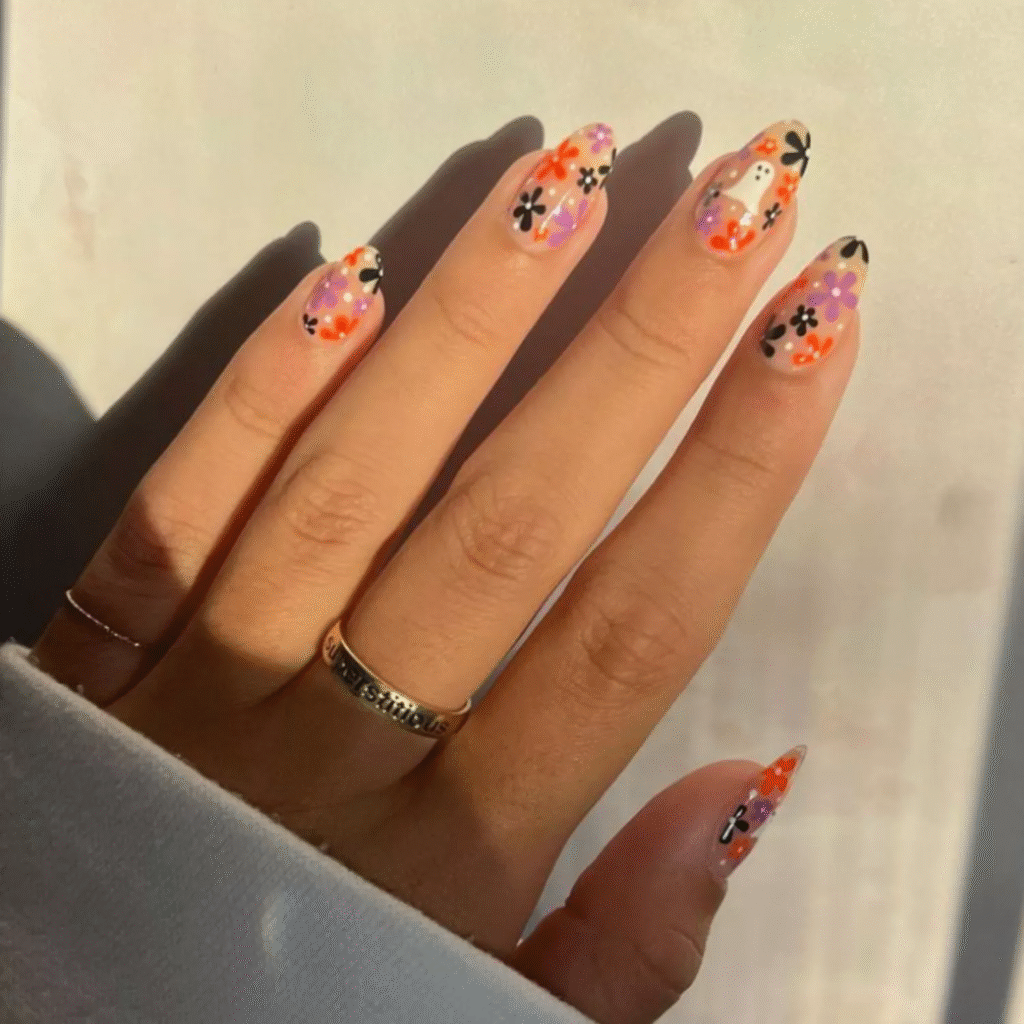 Ghosts don’t have to be scary! Combine flowers in black, orange, and purple with a cute ghost on the middle finger. This design is a playful take on Halloween, perfect for those who love a fun and fresh look.