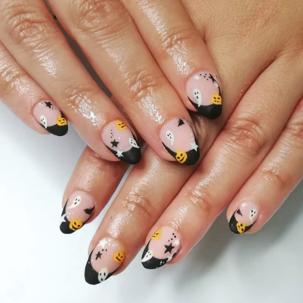Take your traditional French manicure to the next level with Halloween motifs. Black tips, little pumpkins, stars, and of course, some ghosts, will make your French manicure Halloween-ready in no time.
