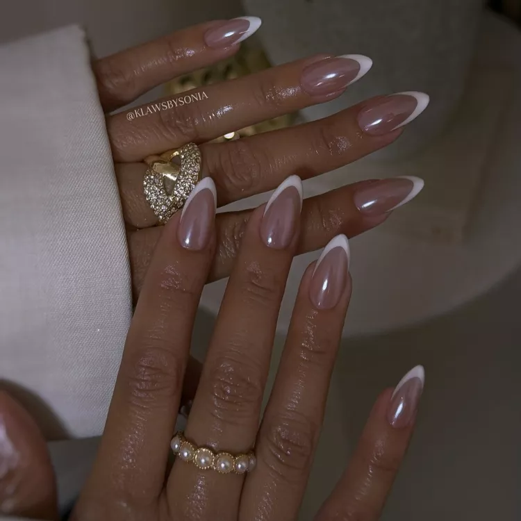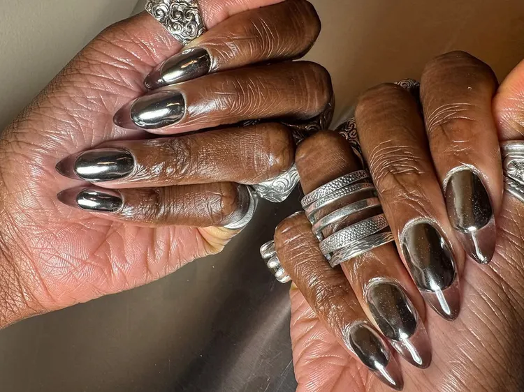 Elevate the classic French manicure with chrome powder. Apply chrome on the tips for that shiny, reflective touch. The almond-shaped nails and glossy finish will add an extra dose of sophistication.