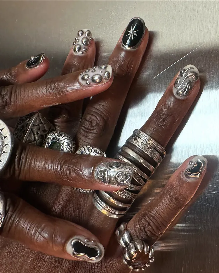 Texture is the star of this design. Start with a milky base, then use 3D builder gel and silver chrome to create a bold, striking look. It’s a great choice for those who want something edgy and modern.