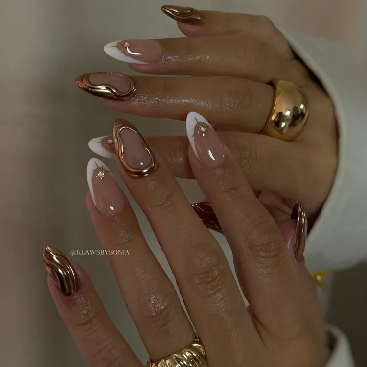 For a more playful design, try this mix of white and gold with chrome accents. The combination of a French tip with a 3D appearance makes these nails a unique and stylish choice.