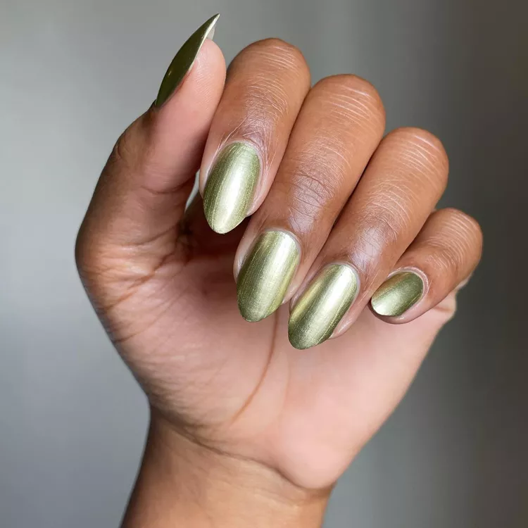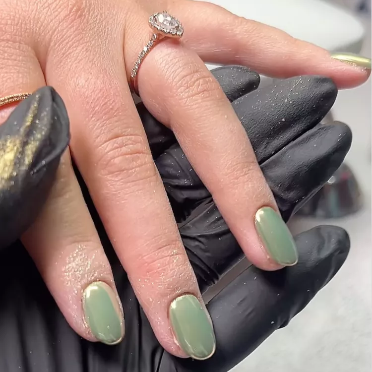Sage green nails are a huge trend this fall. Pair it with silver chrome for a gorgeous combo that perfectly represents the season. The muted green with chrome accents is simple yet stunning.
