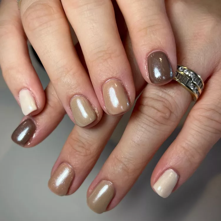 Chocolate shades are a must-have for fall. Create a gradient look using dark to light brown tones, and consider adding builder gel to strengthen your nails while keeping them stylish.