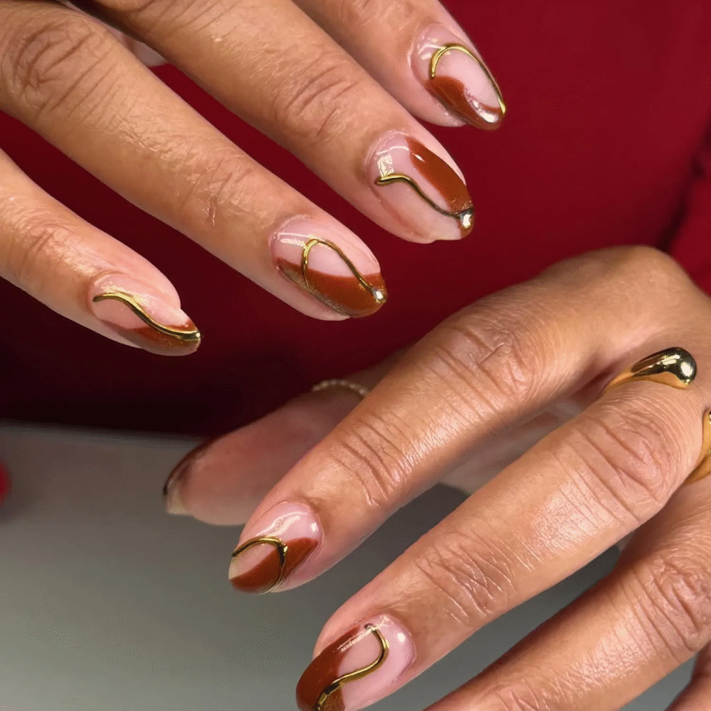 For something a bit more refined, try a simple swirl design with a 3D gold chrome swirl on top. The star of this look is chocolate brown, but you can also try terracotta, wine, olive, or plum shades. This design brings a luxurious, rich feel to your nails.