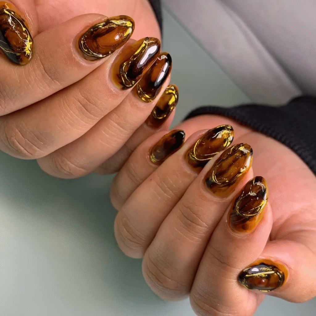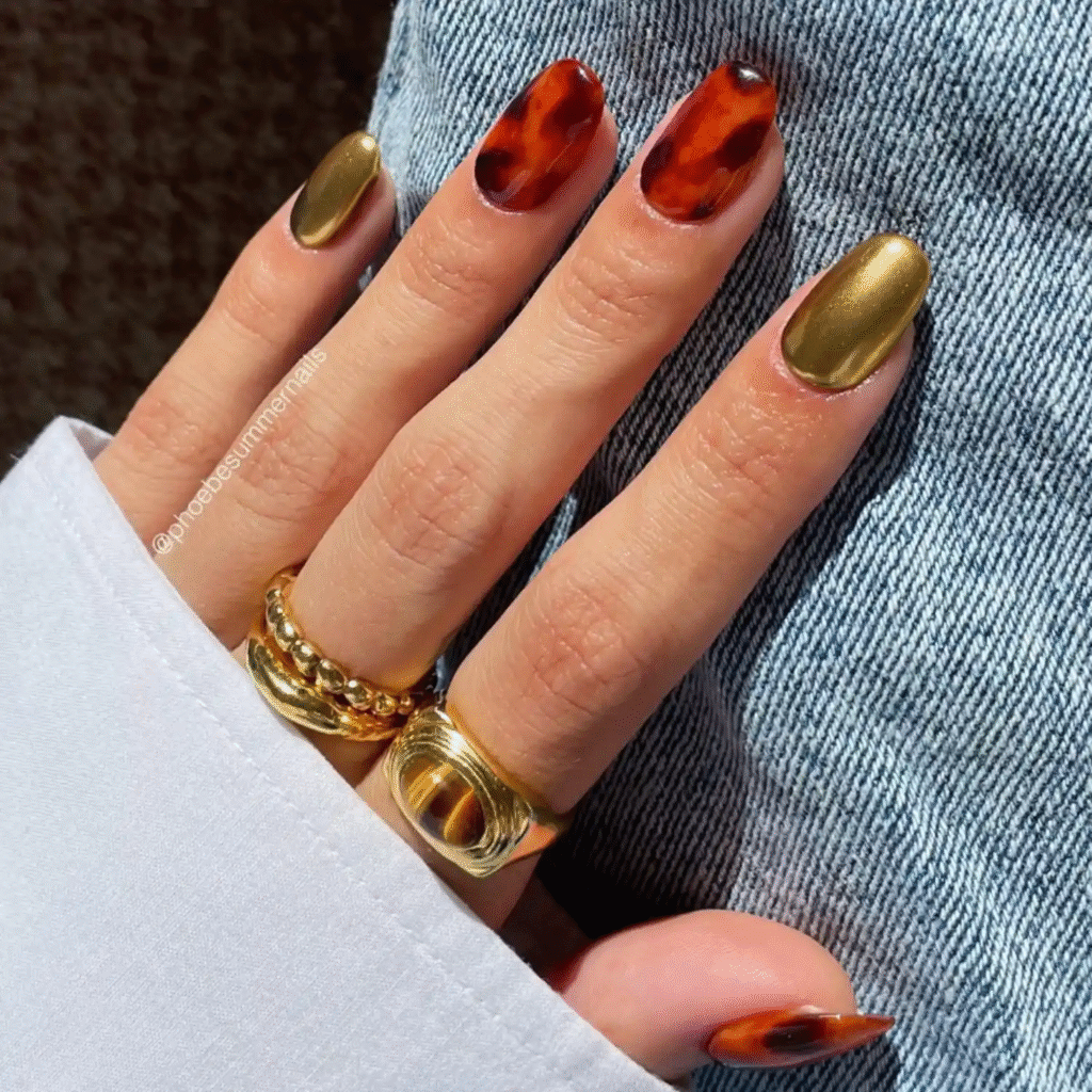 Tortoiseshell and gold are two of the best accents for fall, and they pair beautifully in this short nail design. Tortoiseshell adds a touch of warmth, while the gold chrome accents bring a luxurious feel. This look is perfect for a simple yet eye-catching autumn style.