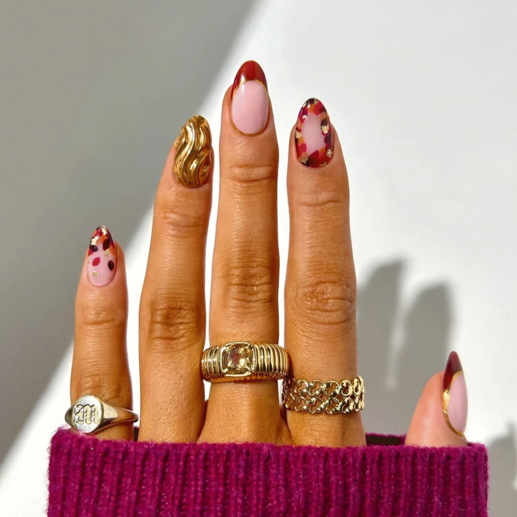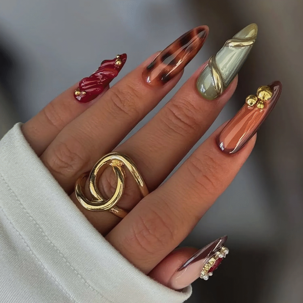 This design is perfect for those who love bold nails. A mix of terracotta, tortoiseshell, sage, and wine polishes creates a rich, autumnal look. Add gold accents and 3D details, and you have a dramatic, mismatched chrome manicure that’s perfect for the season.