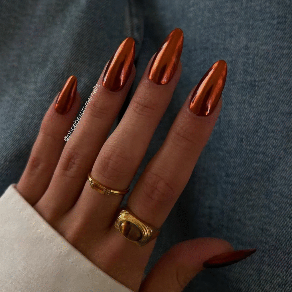 Chrome manicures have become one of the most popular nail trends, and it’s no surprise. The shine from a chrome finish is simply mesmerizing, whether you’re going for a sheer glazed effect or a more opaque metallic look. Chrome nails are versatile, making them perfect for every season, including fall. This October, we’re seeing a lot of nail designs inspired by autumn foliage, jewel tones, and Halloween themes, all made even more stunning with a chrome finish.