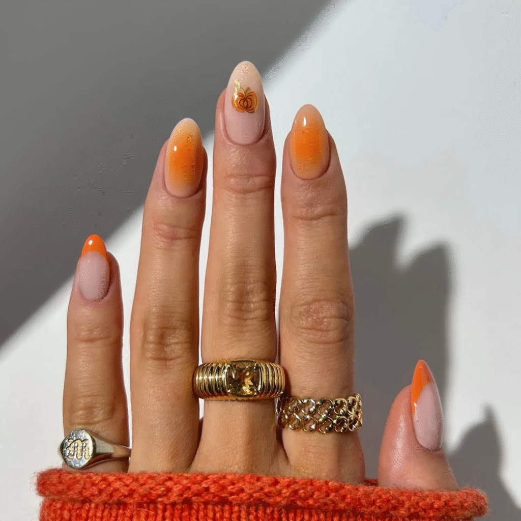 Get into the Halloween spirit with a pumpkin palette and French tips. This modern twist on classic French nails is complemented by a pumpkin accent design. It’s festive yet stylish, perfect for the autumn season.