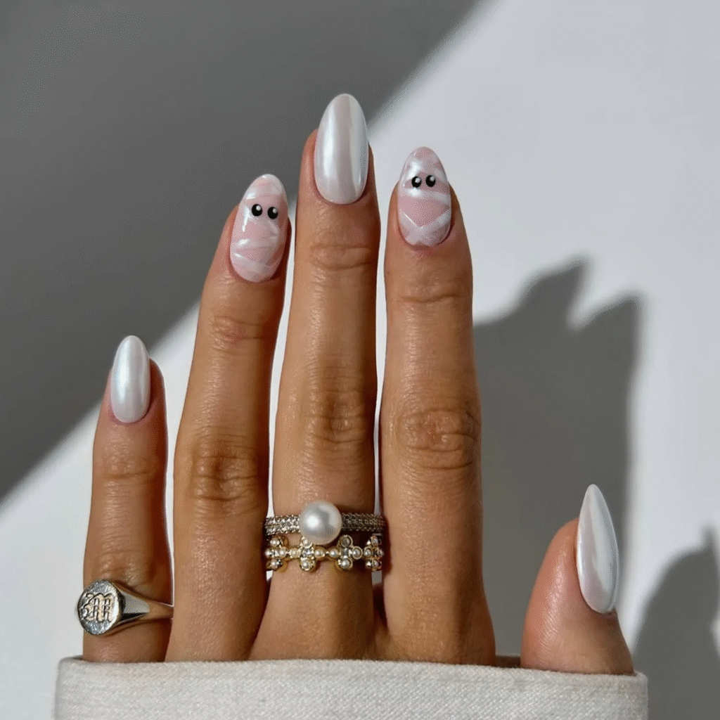 For a subtle Halloween design, try white chrome nails with mummy accents. Using a dotting tool and nail art brush, you can create adorable mummy designs on two of your nails. It’s a cute, easy-to-create design that’s perfect for October.