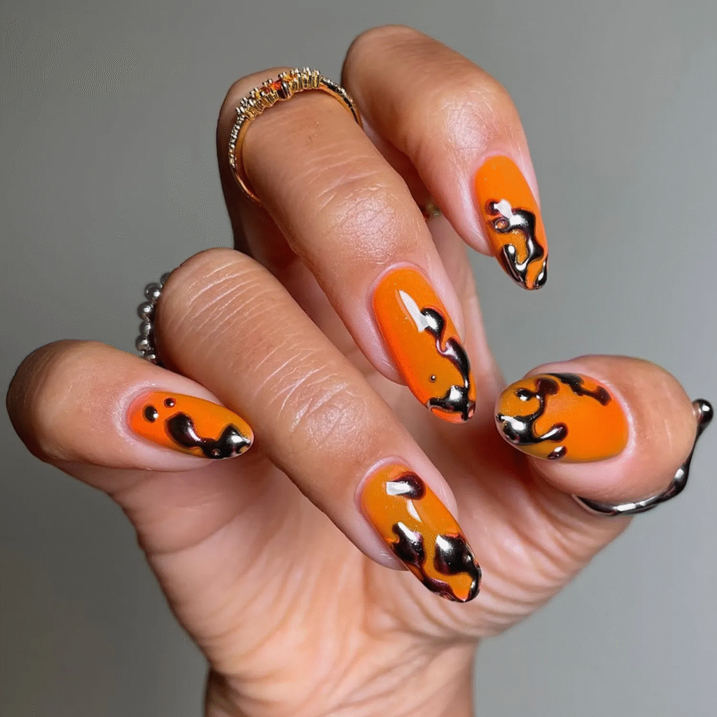 This orange manicure with chrome lava lamp-inspired drips adds an edgy twist to your seasonal nails. Start with a neon orange base and top it off with 3D gunmetal chrome splotches for a fun, unique design. It’s perfect for those who want something a bit different this fall.