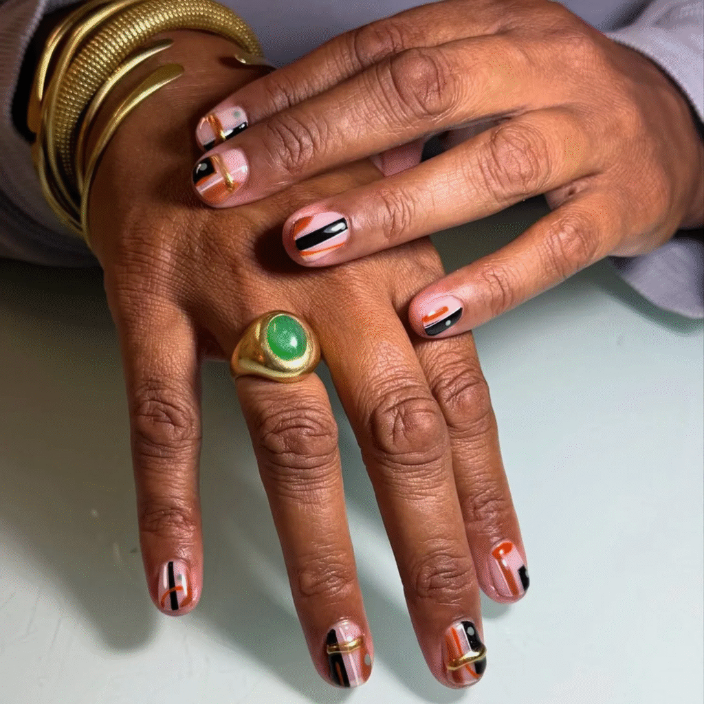Inspired by the witchy vibes of Halloween, this reflective burnt orange chrome design is bold and dramatic. It’s perfect for the season and will have you channeling your inner Sanderson sister or Halloweentown character. If you love maximalist styles, this one’s for you.