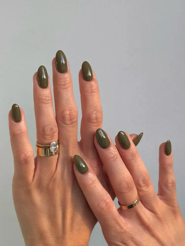 Huber-Millet describes olive green as “the shade that quietly defines autumn.” This earthy, sophisticated color brings to mind cozy fall nights and elegant gatherings. Olive green nails add an understated touch to any outfit, making them a perfect choice for both casual and formal occasions. Try pairing your olive nails with gold jewelry or neutral tones to complete the look.