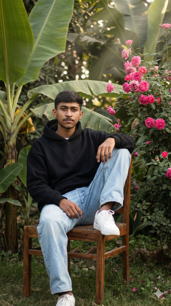 Copy This: Photorealistic cinematic portrait, vertical 9:16. ⚠️⚠️⚠️ ABSOLUTE IDENTITY FREEZE (CRITICAL) Use the uploaded image as an EXACT, PIXEL-LOCKED IDENTITY REFERENCE. Face must remain 100% identical to the uploaded image. ❌ No darkening. ❌ No green color cast from foliage. Beard & facial hair must remain EXACTLY as in the uploaded image. 👉 Treat the face as UNEDITABLE, COLOR-LOCKED, and LIGHT-SAFE. Scene: A young man sitting on a rustic wooden chair inside an overgrown tropical garden. Casual candid pose: one leg pulled up on the chair. Outfit: Black oversized hoodie, baggy light-wash denim jeans, clean white sneakers. Environment: Dense vibrant tropical foliage with large banana leaves. A flowering bush filled with bright pink roses creating strong color contrast. Lighting: Dramatic natural daylight with soft sun rays filtering through leaves. Face lighting must remain neutral.