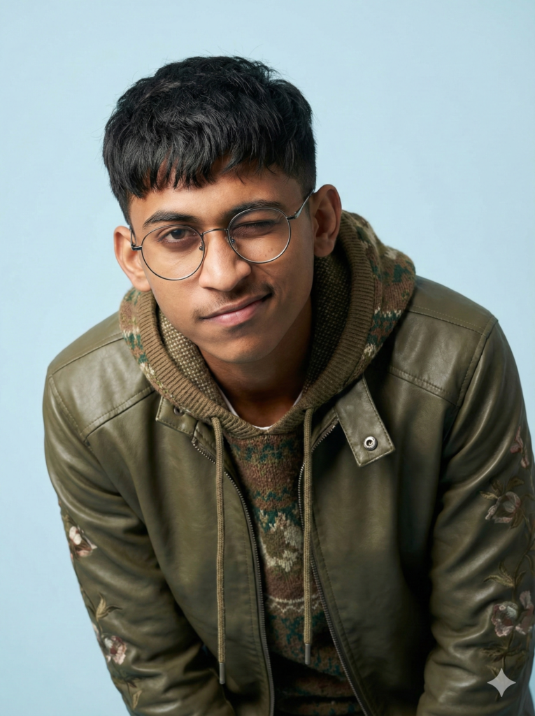 Copy This: A high-quality studio portrait of a young man leaning slightly forward toward the camera, giving a confident, playful wink. He has the exact same face identity as the uploaded reference image, including facial structure, eyes, nose, lips, skin texture, and proportions. If facial hair is present, it must be preserved exactly as-is. Outfit: Olive-green leather jacket with subtle floral embroidery, layered over a patterned knitted hoodie. Lighting: Soft, professional studio lighting emphasizing realistic skin texture. Background: Clean light pastel blue/white seamless studio backdrop. Camera framing: Medium close-up, 85mm portrait lens look, shallow depth of field, ultra-sharp focus on the face. CRITICAL RULE: Maintain 100% facial similarity. No face morphing, beautification, or identity drift. 8K detail.