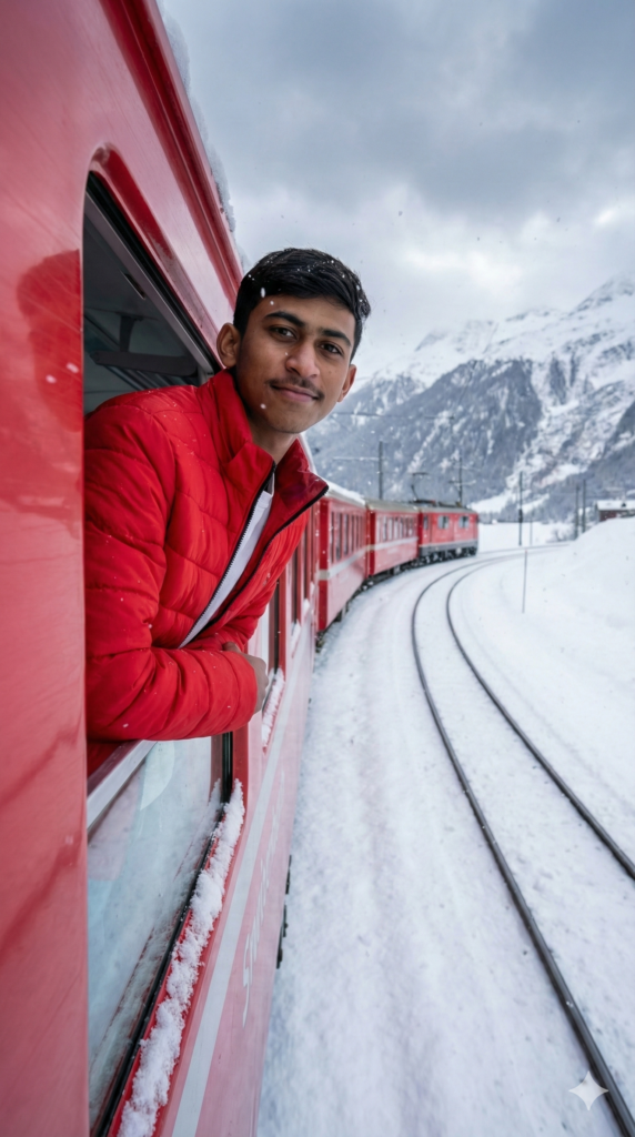 Copy This: Use the uploaded image to retain the exact facial features, attire, and expression structure. The face shows a soft, subtle smile with a calm, relaxed expression. The person is wearing a bright red puffy jacket, leaning slightly out of a red train window. The train is traveling on a curved railway track through a snow-covered landscape, with snow-capped mountains in the background under an overcast sky. The scene has a winter travel atmosphere, with natural vibrant colors and a high-angle shot. Ultra-realistic quality, 16K resolution, 9:16 vertical image.