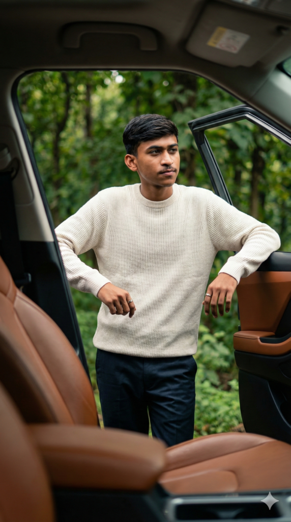 Copy This: Cinematic ultra-realistic lifestyle portrait, vertical 9:16. ⚠️⚠️⚠️ ABSOLUTE IDENTITY FREEZE (CRITICAL – NON-NEGOTIABLE) Use the uploaded image as an EXACT, PIXEL-LOCKED IDENTITY REFERENCE. Face must remain 100% identical to the uploaded image. Skin tone, undertone, brightness, contrast must remain EXACT. ❌ No darkening. ❌ No warm tint on face. ❌ No cinematic color shift on skin. Beard / facial hair must remain EXACTLY as in the uploaded image. Hair & hairstyle must remain EXACTLY unchanged. 👉 Treat the face as UNEDITABLE, COLOR-LOCKED, and LIGHT-SAFE. Scene: A handsome young man leaning casually against the open door of a modern SUV, camera viewpoint from inside the car. Softly blurred warm brown leather seats in the foreground. Pose: Relaxed posture, calm and confident side-glance expression. Outfit: Off-white textured knit sweater, tailored dark trousers. Minimal silver rings. Environment: Lush green forest visible outside. Lighting: Soft natural daylight. Earthy warm tones for the environment ONLY. Face lighting must remain neutral.