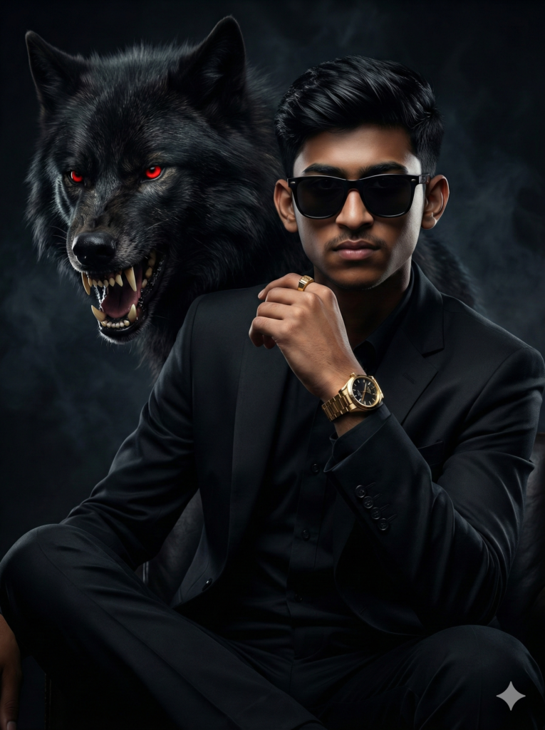 Copy This: Create an ultra-realistic image using the reference photo face exactly the same. A stylish young man is sitting confidently, wearing an all-black suit, black shirt, and black sunglasses. One hand is placed near his face, clearly showing a gold watch and a gold ring. Behind him stands a large black wolf with glowing red eyes and sharp teeth, snarling fiercely. The wolf looks powerful and protective. The background is dark and dramatic, creating a mysterious and strong atmosphere. Cinematic lighting highlights the man’s sharp hairstyle and confident expression. Ultra-realistic, 16K HD, high detail, dark mood.