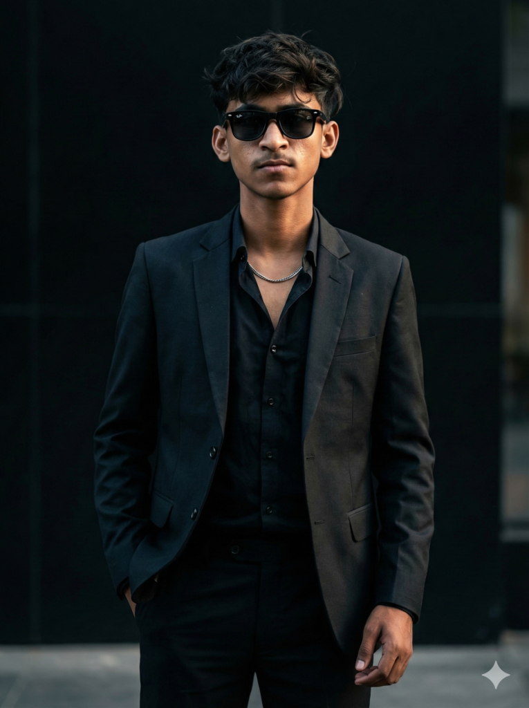 Copy This: Ultra-realistic, cinematic 256K resolution close-up half-body portrait of a young, handsome man (use the exact same face from the provided reference image). The subject is standing casually, confident and relaxed, with one hand placed in his pocket. He wears a premium dark black tailored suit, paired with a half-unbuttoned black shirt, black trousers, and a sleek silver chain. He is wearing stylish black sunglasses. The lighting is cinematic and dramatic, featuring soft rim light and controlled shadows. Hyper-detailed skin texture, natural pores, sharp jawline, and realistic fabric folds are clearly visible. The background is sleek black and subtly blurred. Shot with a cinematic lens, shallow depth of field, editorial luxury fashion photography style.
