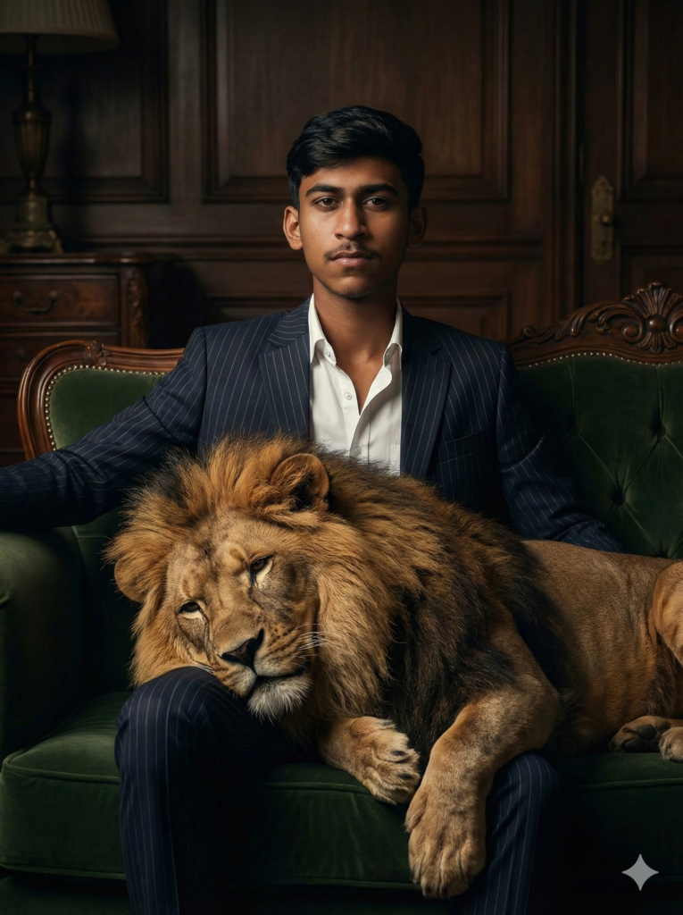 Copy This: A hyper-realistic cinematic portrait of the uploaded man, created with absolute ID locking to preserve his exact facial structure, skin tone, hairstyle, age, and proportions with 100% accuracy. He embodies the presence of a powerful, calm, and domineering gangster. The man is seated confidently on a luxurious deep-colored velvet sofa. His head is slightly tilted downward, eyes focused with an intense, calm gaze. A majestic adult lion rests naturally across his lap, its body relaxed, reinforcing the man’s authority. Lighting is low-key and cinematic, with soft rim light outlining facial contours. Deep shadows add drama. Color grading is rich and moody. Ultra-sharp focus, 8K detail. The face must be unmistakably identical to the uploaded image.