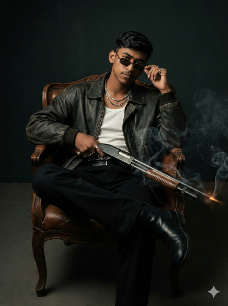 Copy This: A high-fashion editorial photo of a young man using the uploaded image for exact face reference. His face must match the reference image 100%. He is sitting casually and slightly slouched in a chair, looking confident while glancing over the rim of small rectangular retro sunglasses. He is wearing an oversized dark vintage leather bomber jacket over a white ribbed tank top, paired with black trousers and black boots. He has multiple silver rings and chains. He is holding a shotgun, with a subtle firing/muzzle flash effect and light cinematic smoke. Lighting: Dark and cinematic, soft shadows. Style: Ultra-realistic, sharp focus, cinematic color grading, professional fashion photography.