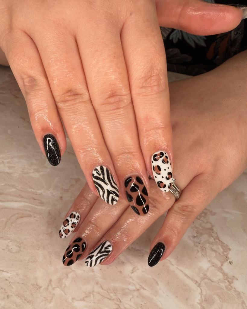 Why choose between zebra and leopard prints when you can have both? Mixing these two iconic patterns on your nails gives a fun and exotic twist. One finger can feature zebra stripes, while the others can showcase the wild spots of a leopard. This mix makes your nails stand out, offering a playful yet sophisticated edge.