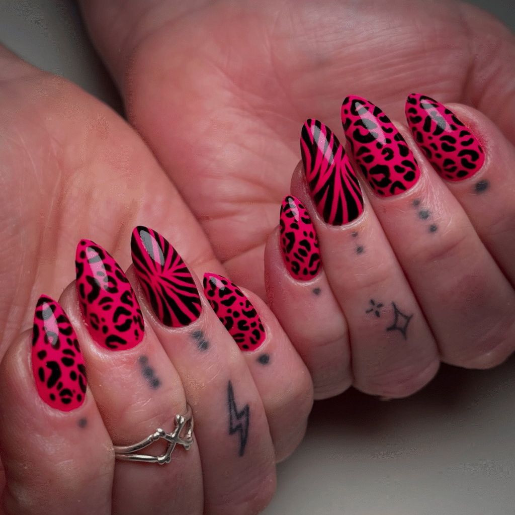If you like your nails to pop with color, then try a combination of bright pink leopard and zebra print. The contrast of the hot pink with black creates a fun, bold design that’s impossible to ignore. These nails give off major “wild” vibes and are perfect for someone who wants to make a statement.