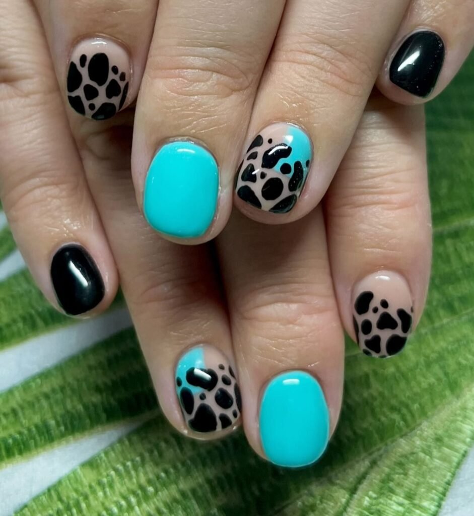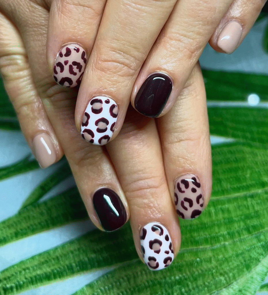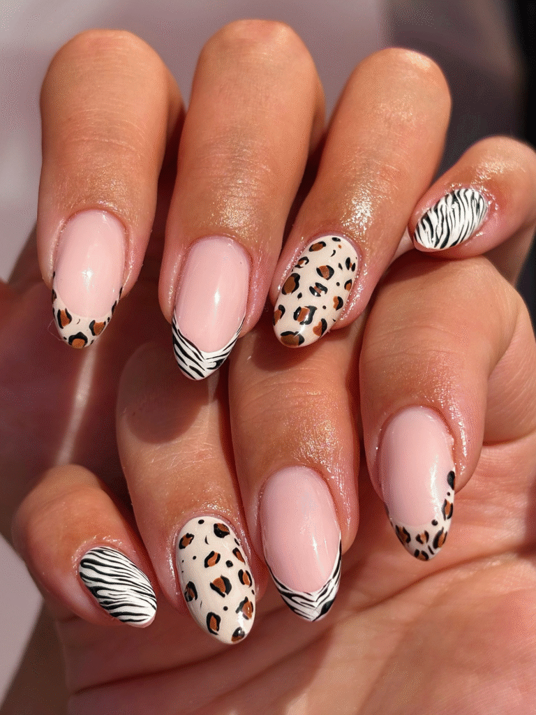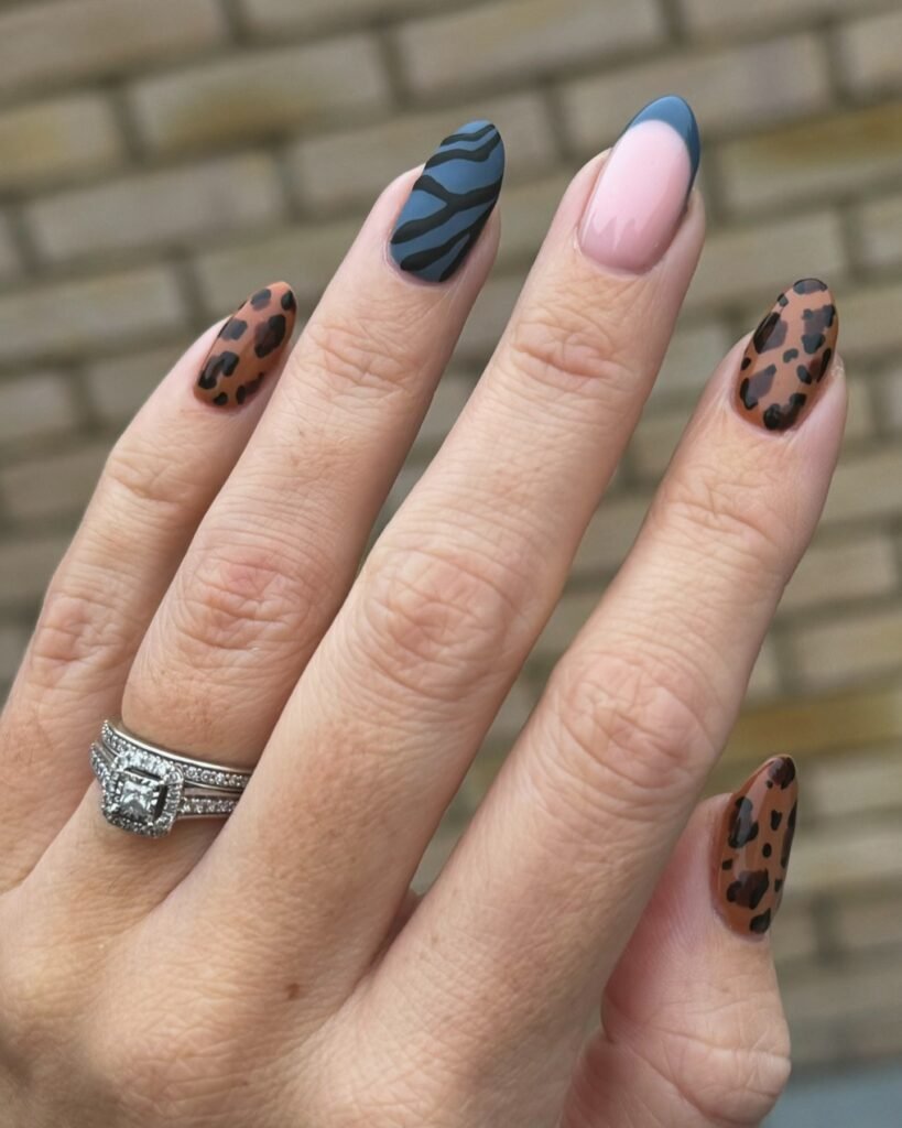 Mixing earthy tones with animal print is a great way to create a stylish yet grounded look. The combination of olive green with leopard and zebra patterns creates a sophisticated, nature-inspired vibe. This is a great option for anyone who loves a bit of nature’s wild side on their nails but prefers more muted, earthy colors.