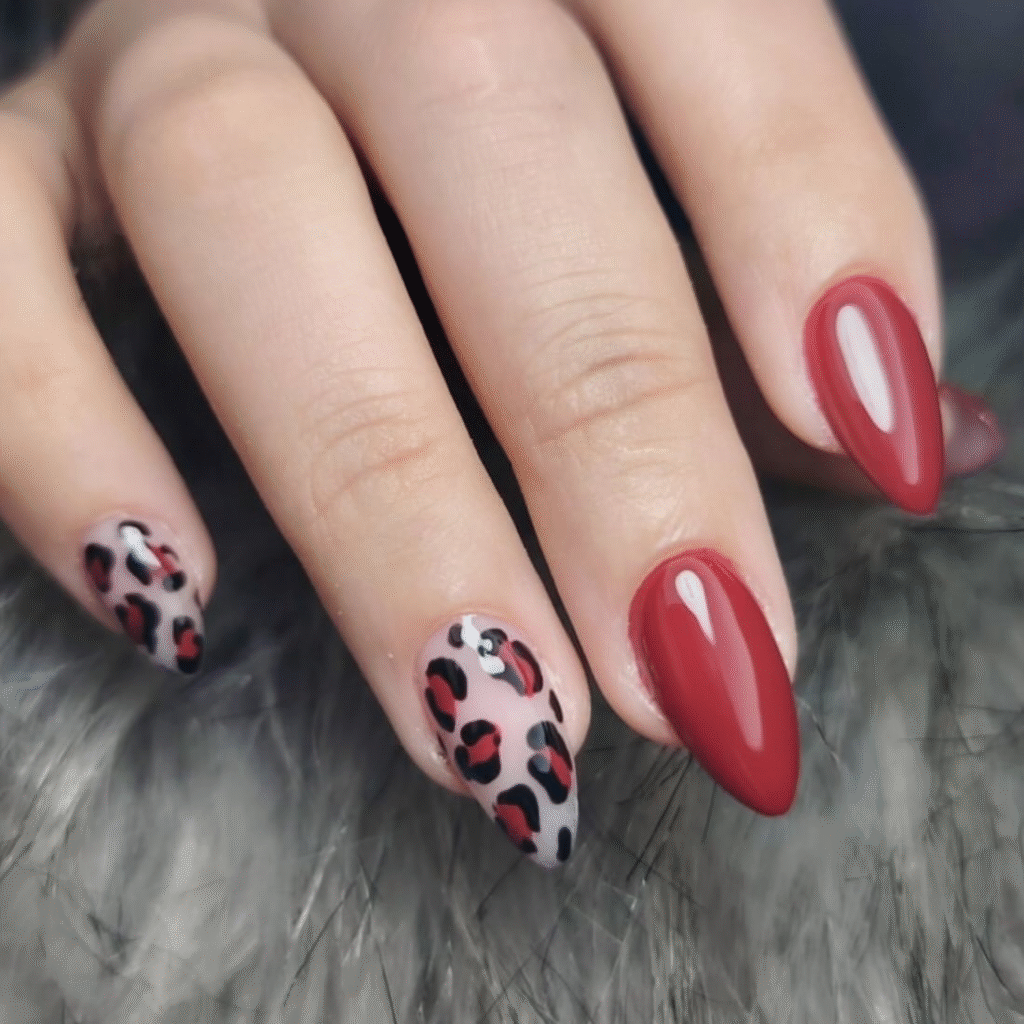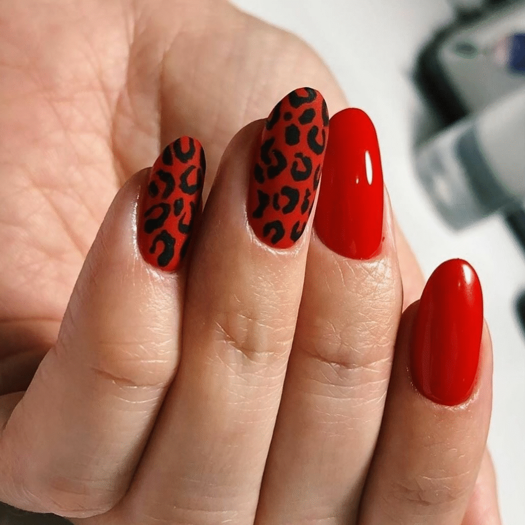 If you’re looking for something bold and daring, why not try red and black leopard print nails? The combination of red polish and dark leopard spots creates a striking, high-contrast design. Whether you’re attending a party or a night out, these nails will definitely grab attention. Plus, the bold colors make your hands look extra fierce.
