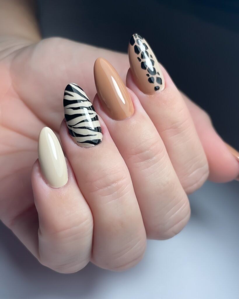 If you’re a fan of neutral colors but still want a standout design, try mixing solid neutral nails with a single bold zebra print accent. The muted tones of beige and brown contrast beautifully with the striking black stripes of the zebra print, creating a unique and stylish look. This design is perfect for a more professional or understated yet fashionable appearance.