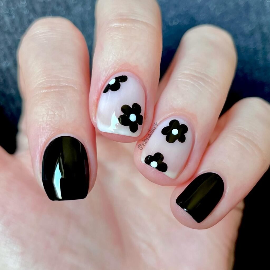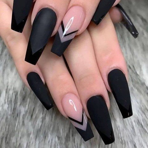 For a more artistic vibe, black nails with white designs like lines or dots can give your nails an edgy, modern feel. This is perfect for those who like to experiment with nail art while keeping it dark and mysterious.