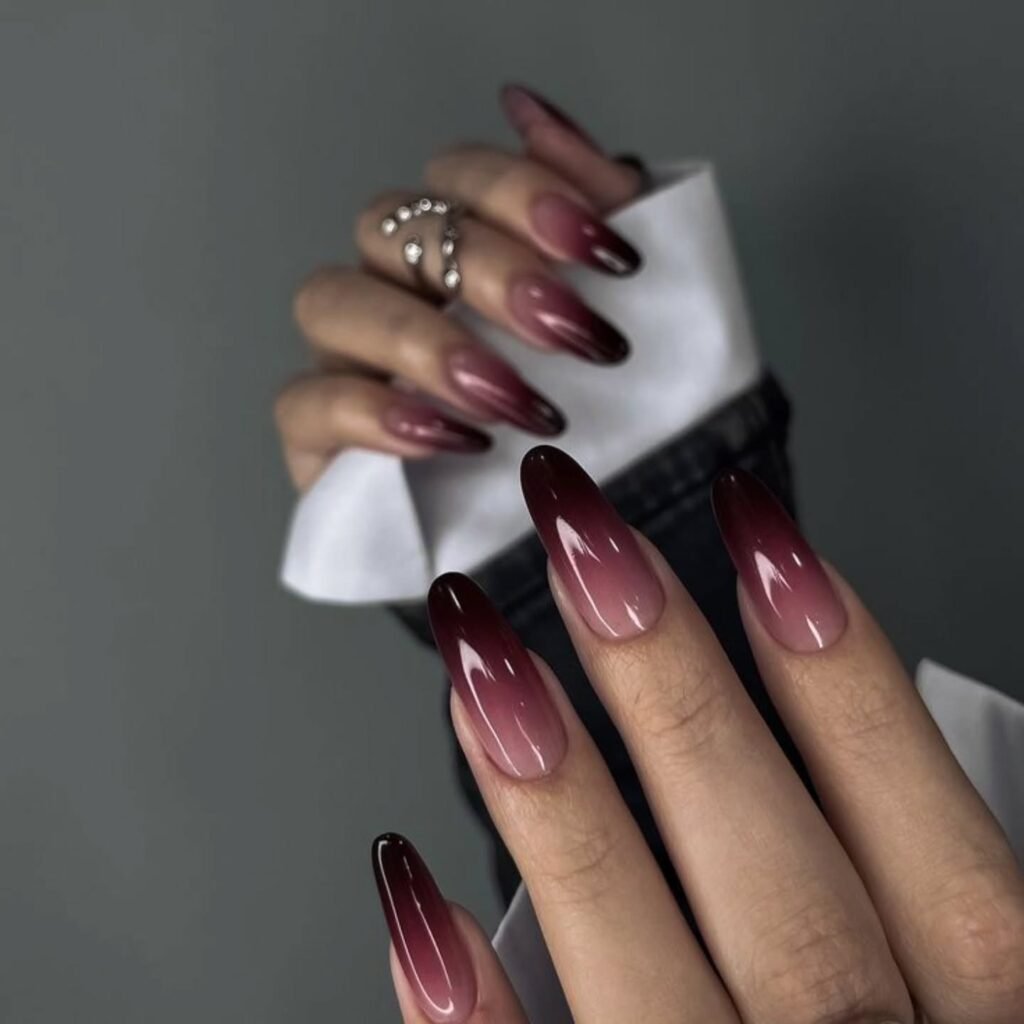 Dark ombre nails blend two or more shades of dark colors to create a gradient effect. You can mix dark purple with black or burgundy with dark brown for a look that’s both moody and trendy. The ombre effect gives depth to the nails, making them look more intricate.