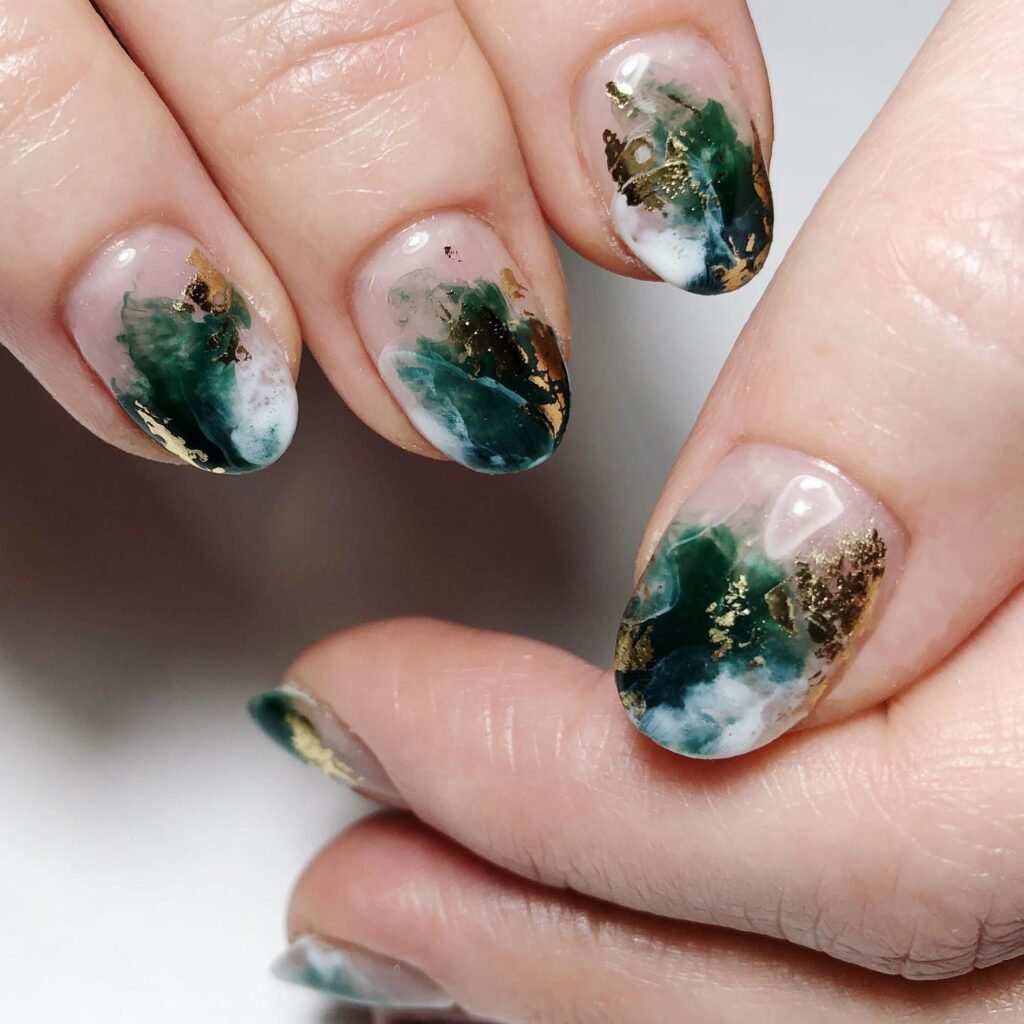 Dark gray nails with gold leaf are a great way to combine elegance and a little bit of nature. The gold leaf adds texture and luxury to the matte gray base, making your nails look unique and fashionable.