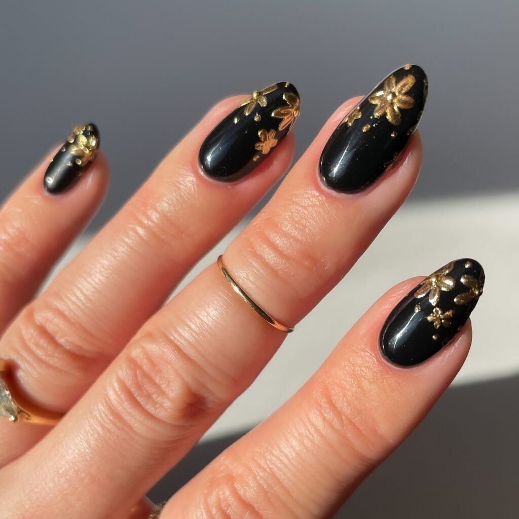 Black and gold is a combination that screams luxury and glamour. A dark black base with gold accents, whether through glitter, stripes, or dots, will make your nails look like a work of art. This look is perfect for a night out.
