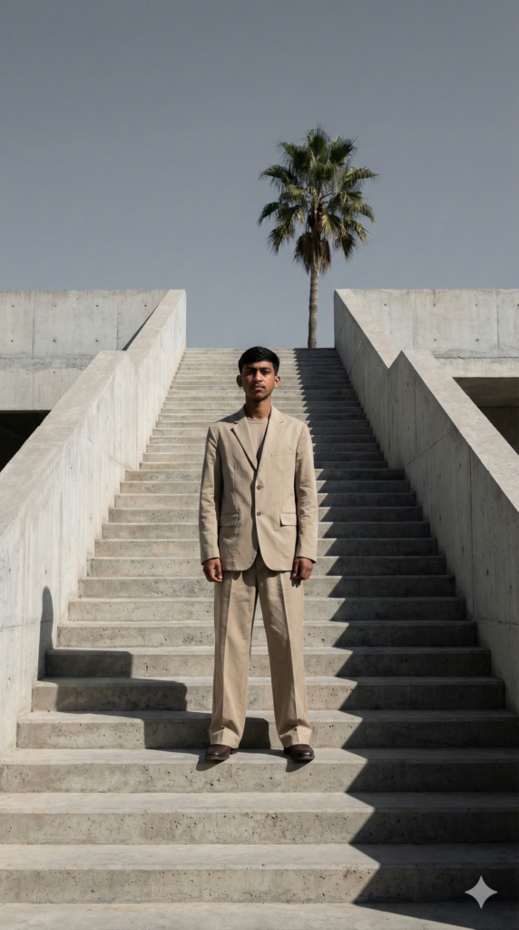 Copy This Prompt: A wide-angle shot of a man standing solo in the center of a massive, raw concrete staircase of a minimalist brutalist building. He wears a monochromatic outfit: a sand-colored technical blazer and matching wide-leg trousers. His pose is geometric and still, hands at his sides. The harsh, direct midday sun creates sharp, dramatic shadows that play off the angles of the stairs and his clothing. In the background, a single palm tree breaks the gray skyline. The style is ultra-modern and high-fashion, with a focus on symmetry and architectural scale. Face 100% same as the Uploaded Photo. Aspect Ratio Strictly 9:16 Vertical.