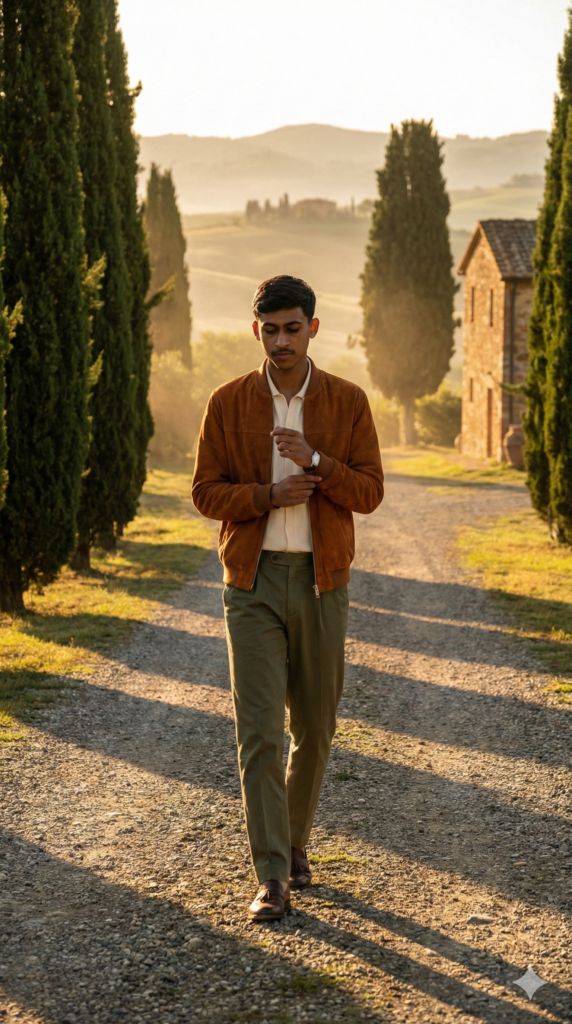 Copy This Prompt: A medium-full shot of a man in his late 18s walking slowly through a gravel path lined with cypress trees. He is wearing a tobacco-colored suede bomber jacket over a cream silk knit shirt and olive green pleated chinos. He is adjusting his cufflink, head slightly tilted down. The background features a rolling hill landscape and the corner of an old stone farmhouse. The lighting is deep “Golden Hour,” with long, dramatic shadows and a warm haze. The image has a rich, cinematic color grade with deep greens and burnt oranges, reminiscent of a luxury fragrance campaign. Face 100% same as the Uploaded Photo. Aspect Ratio Strictly 9:16 Vertical.