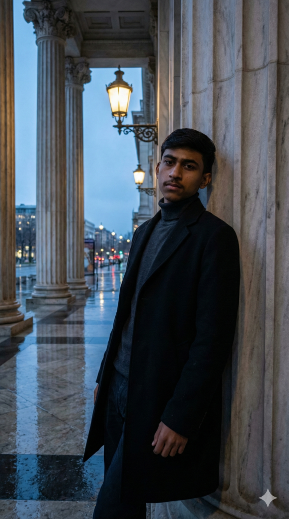 Copy This Prompt: A medium-long shot of a stylish man leaning against a grand marble column of a neoclassical portico at dusk. He wears a charcoal-colored turtleneck under a structured black wool overcoat, paired with slim-fit dark trousers. The blue hour light creates a cool, moody atmosphere, contrasted by the warm glow of a nearby wrought-iron street lamp hitting his face. His expression is thoughtful and stoic. The floor is wet from a recent rain, reflecting the architecture and the dim city lights in the distance. Editorial style, high contrast, with a sharp focus on the textures of the wool and stone. Face 100% Same as the Uploaded Photo. Aspect Ratio Strictly 9:16 Vertical.