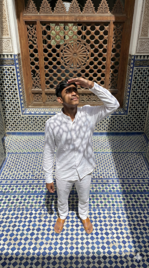 Copy This Prompt: A high-angle shot looking down at a man standing in the center of an intricately tiled zellij courtyard. He is dressed in a minimalist, collarless white linen suit with tan leather sandals. He is looking up toward the open sky, one hand shielding his eyes. The architecture is a mix of carved cedar wood and geometric blue-and-white tiles. Sunlight filters through a carved screen, casting intricate lace-like shadows across his suit. The composition is centered and symmetrical, creating a sense of calm and luxury. Face 100% same as the uploaded photo. Aspect Ratio Strictly 9:16 Vertical.