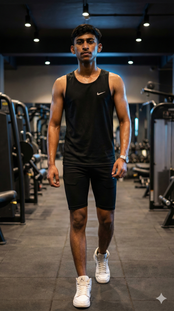 Copy This Prompt: A 4K vertical full-body photo of a man walking inside a gym. He is surrounded by gym machines, with light sweat visible on his body. He is wearing a black Nike tank top, black fitted long shorts, and white Jordan shoes. Accessories include a metal wristwatch and a small cuff earring. His skin tone is warm tan with natural texture and a slight shine from sweat. The gym looks premium and dimly lit, with a rubber floor texture visible. Lighting comes from a hard top light, with a soft blue back light creating a rim effect. The background is slightly blurred, and the subject is clear and sharp, a realistic photo style. Face 100% same as the Uploaded Photo. Aspect Ratio Strictly 9:16 Vertical.