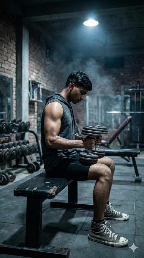 Copy This Prompt: A hyper-realistic, cinematic 8K wide shot of a muscular man sitting on a flat bench in a dimly lit, industrial-style gym with exposed brick walls. He is leaning forward, elbows on knees, holding a heavy metal dumbbell in each hand, looking down with intense focus. He wears a charcoal grey sleeveless hoodie, black compression shorts, and high-top sneakers. Sweat glistens on his skin under a dramatic overhead spotlight that creates deep shadows and highlights his arm definition. The background features blurred racks of weights and a haze of chalk dust in the air. Shot on a 35mm lens with a grainy film texture and desaturated cool tones. Face 100% same as the Uploaded Photo. Aspect Ratio Strictly 9:16 Vertical.
