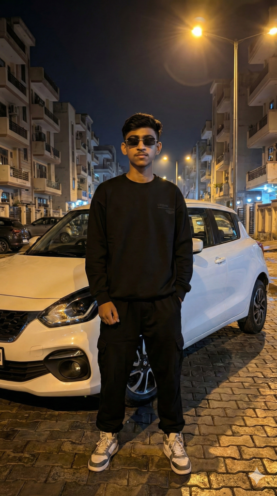 Copy This Prompt: A photorealistic, cinematic full-body shot of a trendy young man with the same hairstyle, dressed in a premium all-black urban streetwear outfit featuring an oversized sweatshirt and baggy joggers. He is posing confidently in front of a sleek white modern hatchback on a city street at night. The ground is paved with textured interlocking cobblestones, reflecting the warm, golden glow of overhead street lamps. The background features multistory urban residential buildings under a dark night sky, creating a moody and atmospheric vibe. High resolution, 8k, sharp focus, realistic fabric textures, professional night photography. 100% my face is the same, rimless rectangular black sunglasses, use the same face as I uploaded. Aspect Ratio Strictly 9:16 Vertical.