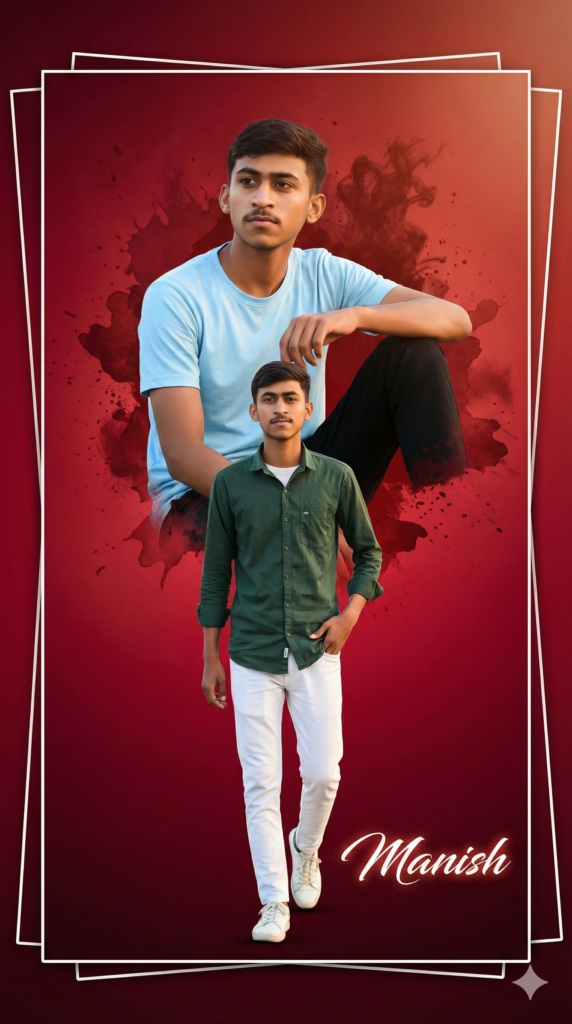 Copy This Prompt: “Ultra-realistic modern portrait poster design with layered photo composition and bold color styling. Main Canvas: Square poster layout with a deep red to dark crimson gradient background, subtle texture, cinematic glow. A thin white rectangular frame around the main poster, with slightly tilted duplicate frames behind to create a stacked poster effect. Foreground Subject: Full-body portrait of a young boy, stylish and confident, standing casually. He wears a dark green button-up shirt, white slim-fit pants, and white sneakers. One hand relaxed near pocket, natural walking pose, confident expression. Upper Background Portrait: A larger half-body portrait of the same boy placed above and behind the foreground figure. Outfit: light sky-blue T-shirt, black pants. Pose: seated casually with one knee raised, hand lifted slightly, thoughtful confident look. Blend Style: The upper portrait blends into the red background using a paint-splash / ink-smoke dispersion effect, with organic edges and soft fade, artistic composite style. Typography: Name text “Manish” written at the bottom right in elegant cursive white font, subtle glow, minimal and classy. Overall Style: Professional poster design, photorealistic subjects combined with graphic design elements, high contrast, clean edges, no illustration, no cartoon, no watermark, no logo. Ultra-detailed, sharp focus, DSLR portrait look, Instagram-ready, high resolution, modern fashion poster aesthetic. Strictly aspect ratio 9:16”