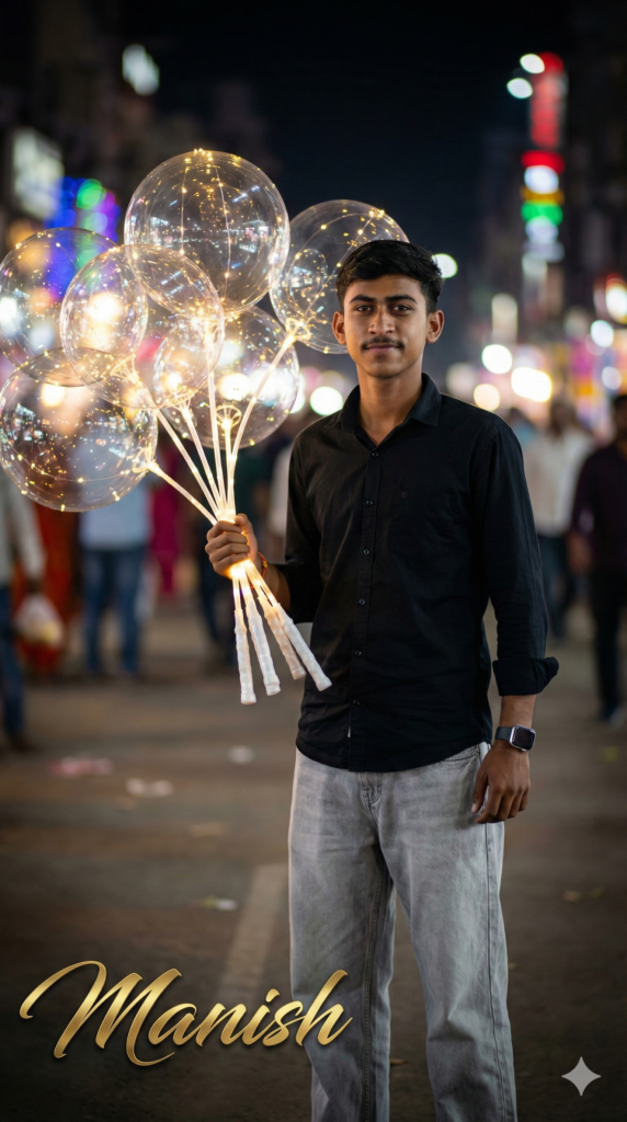Copy This Prompt: “Ultra-cinematic, temperamental full-body night portrait of a handsome man, STRICT IDENTITY LOCK ENABLED. Use the uploaded photo as an EXACT, IMMUTABLE facial reference — facial structure, skin tone, eyes, nose, lips, jawline, beard, expression, and proportions must remain 100% identical to the uploaded image. NO face replacement, NO face enhancement, NO AI reinterpretation. Outfit: Black shirt, light-gray baggy jeans, stylish smart watch held naturally in one hand. Pose & Emotion: Calm, happy, confident night-time expression, natural body posture. Prop: Holding a large bouquet of transparent bright LED bobo balloons, softly glowing, realistic reflections and light diffusion. Environment: Night scene with a busy, colorful street market at the bottom, heavily blurred (bokeh effect), vibrant lights, cinematic depth of field. Lighting: Low-key cinematic night lighting, soft rim light around hair and shoulders, realistic shadows, moody yet elegant tone. Text Overlay (bottom-left): “Manish” in metallic gold or silver stylish font, elegant and premium look. Aspect Ratio: STRICTLY 9:16 (Vertical)”