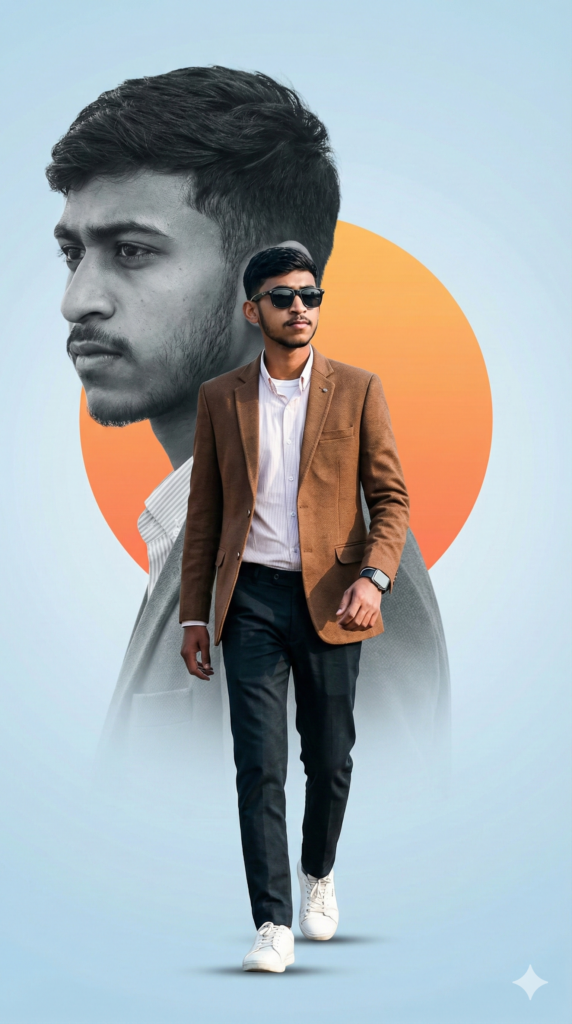 Copy This Prompt: “A stylish young man with the same beard, wearing black sunglasses, a brown blazer over a white shirt, dark fitted trousers, and white sneakers. He is walking confidently, with a modern wristwatch visible on his hand. The background is minimal, with a soft blue gradient and an artistic large orange circle like a sun behind him. Behind the main subject, there is a larger monochrome portrait of the same man in black and white, looking serious and facing sideways, blending smoothly into the background. Make sure the face matches 100% with the uploaded photo. The image has a cinematic, polished, and professional look with high contrast and sharp details. Aspect Ratio: STRICTLY 9:16”