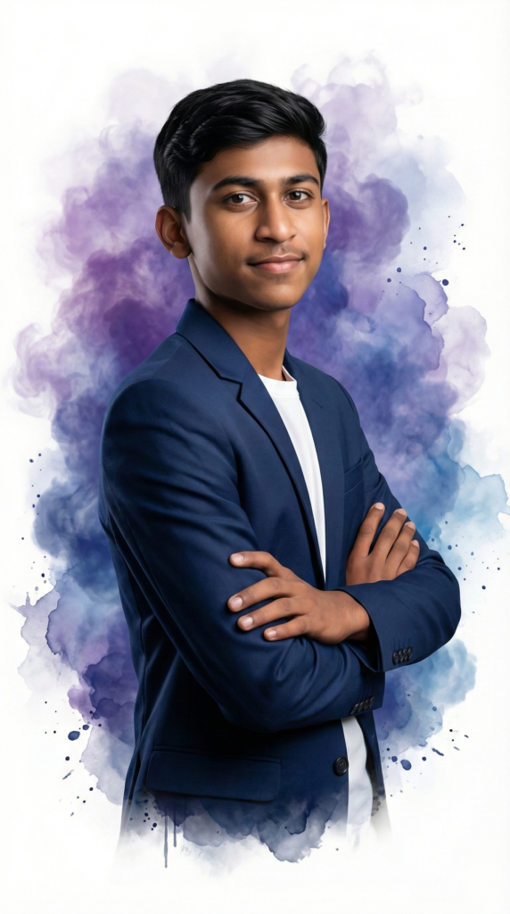 Copy This Prompt: “Ultra-realistic 8k photo of a young Indian boy in a 3/4 side profile, body turned slightly away, head turned back toward the camera, with a gentle, confident smile. His arms are folded across his torso, right hand resting naturally on the left forearm (exact pose match). He has smooth medium-brown skin, defined youthful facial features, a soft natural expression, same eyes, and neatly styled black hair, side-combed with subtle volume and clean edges. He wears a modern tailored blazer in deep navy blue, single-breasted, slim-fit cut, paired with a crisp white crew-neck or shirt underneath, minimal and elegant. The background features abstract flowing smoke clouds in shades of purple, indigo, and blue, forming a soft painterly halo around the subject, gradually fading into a clean white canvas, with a watercolor and ink-splash artistic effect. Soft diffused studio lighting, cinematic depth, sharp facial details, realistic skin texture, painterly realism, high contrast with soft feathered edges, centered composition with the subject slightly off-center, fine-art editorial portrait aesthetic. 8K resolution, ultra-detailed, hyper-realistic, no text, no watermark, no blur, no distortion. Aspect Ratio: STRICTLY 9:16 (Vertical)”