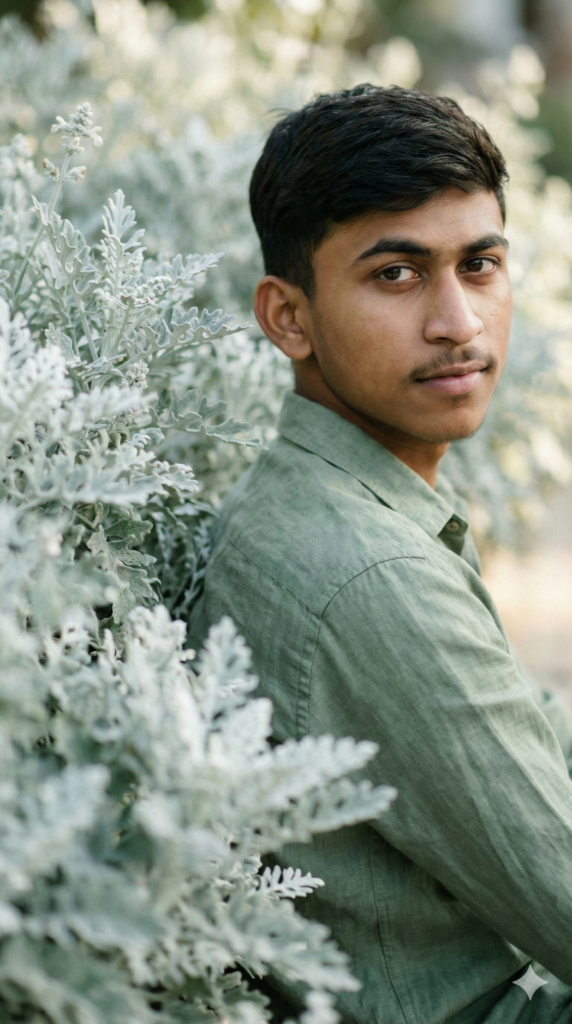 Copy This Prompt: “Dreamy cinematic editorial photography of a young man based from reference photo, medium shot (half body). Subject placed on the right side of the frame, his body facing away from the camera but his face turning back looking directly into the lens. Outfit: sage green linen shirt, subtle botanical tone. Foreground: from the center to the left side of the frame fully covered by soft blurred aesthetic sage Dusty Miller flower, creating an artistic natural frame. The man has the same face, hairstyle. Aspect Ratio: STRICTLY 9:16”